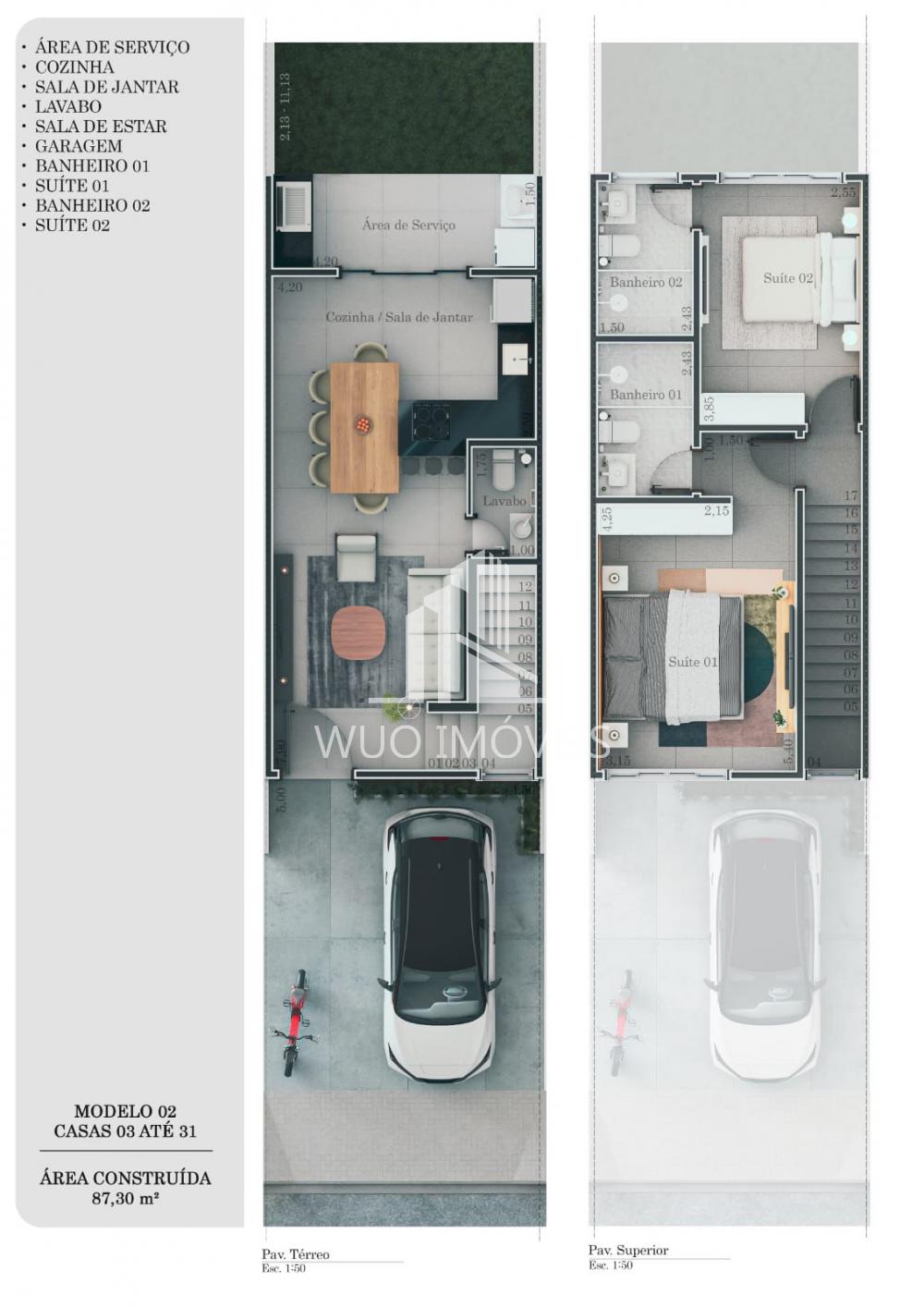 Sobrados Modernos: Cada unidade conta com duas suítes, sala de estar e jantar integradas, cozinha americana, área de serviço, lavabo e uma vaga de garagem. Com 87,30m² de área construída, cada detalhe foi pensado para o seu conforto e bem-estar.