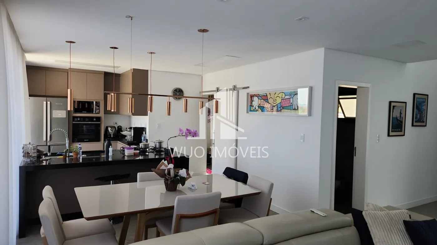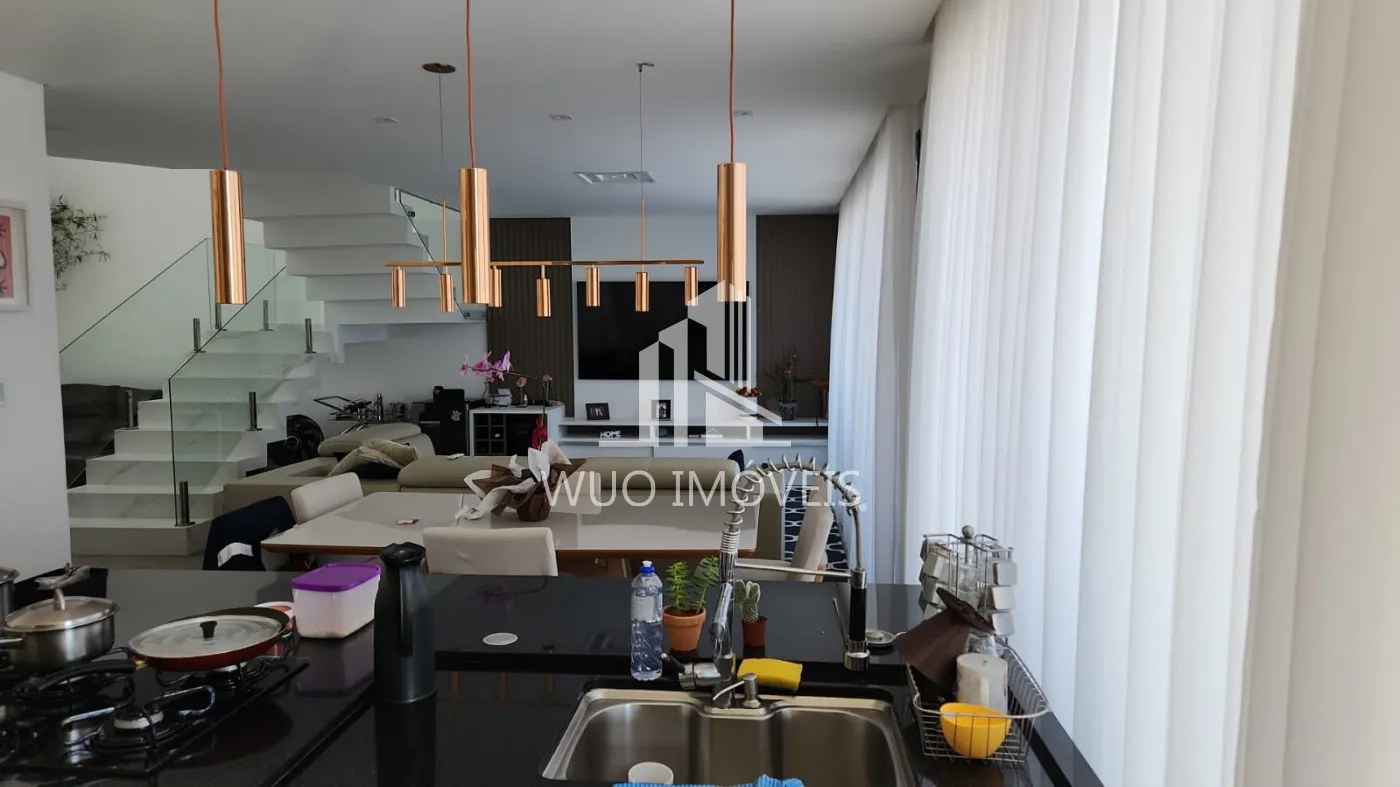 A cozinha moderna integrada, com ilha central, é perfeita para quem valoriza funcionalidade e design. O imóvel ainda dispõe de lavanderia, despensa, lavabo interno e lavabo externo, garantindo praticidade no dia a dia.