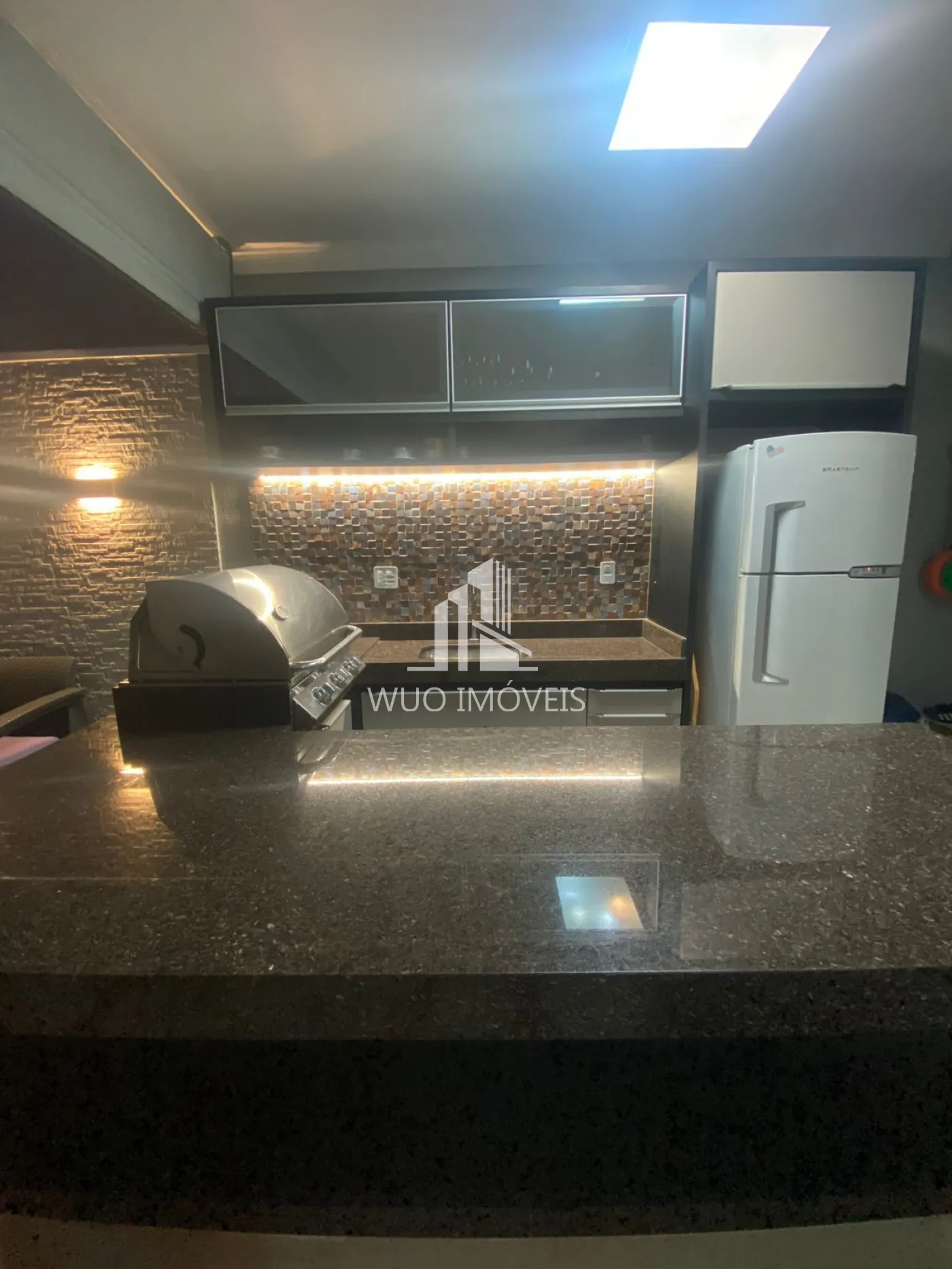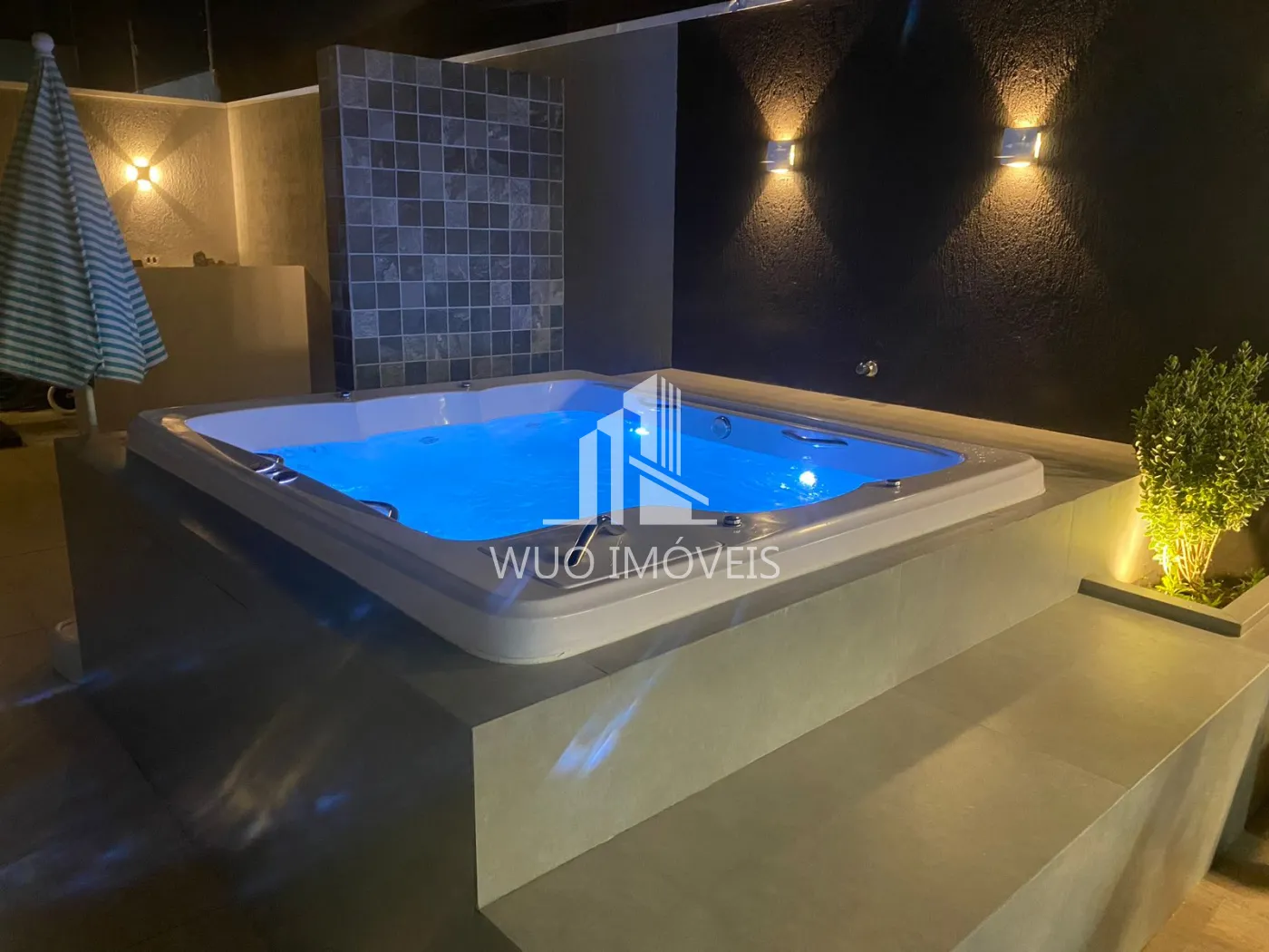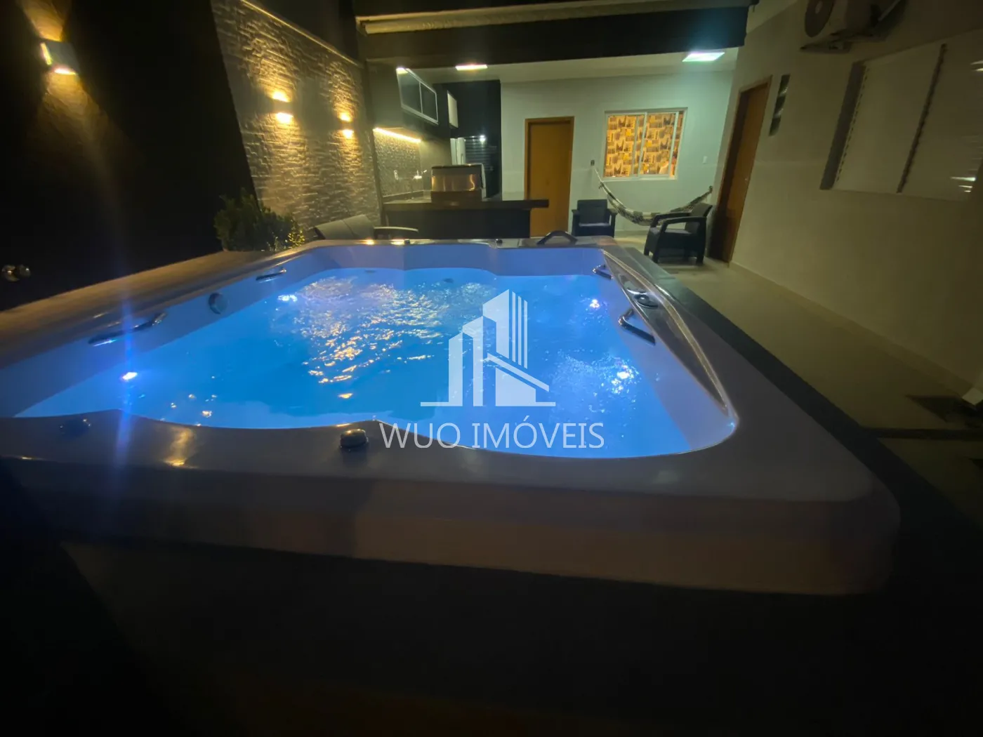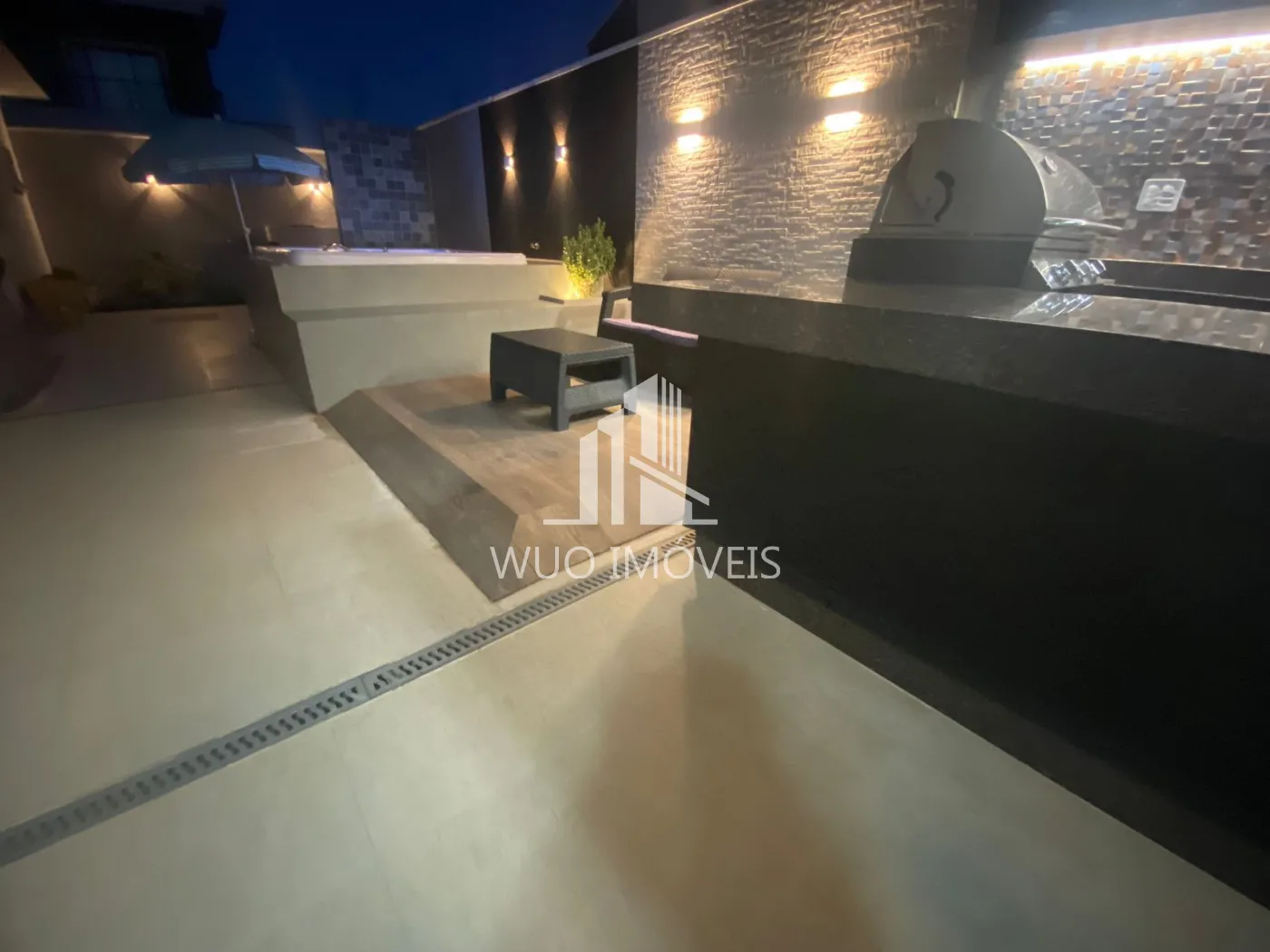 Varanda gourmet estilo americana a gás, deck com jacuzzi e ducha.